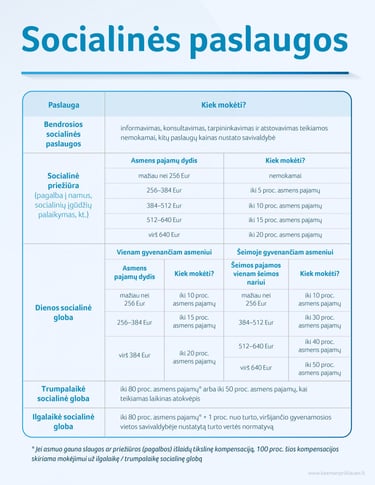 Paslaugos apmokėjimas: Kai sprendimą skirti paslaugas priima savivaldybė, dalį kainos apmoka paslaugos gavėjas, o likusią dalį kompensuoja savivaldybė.